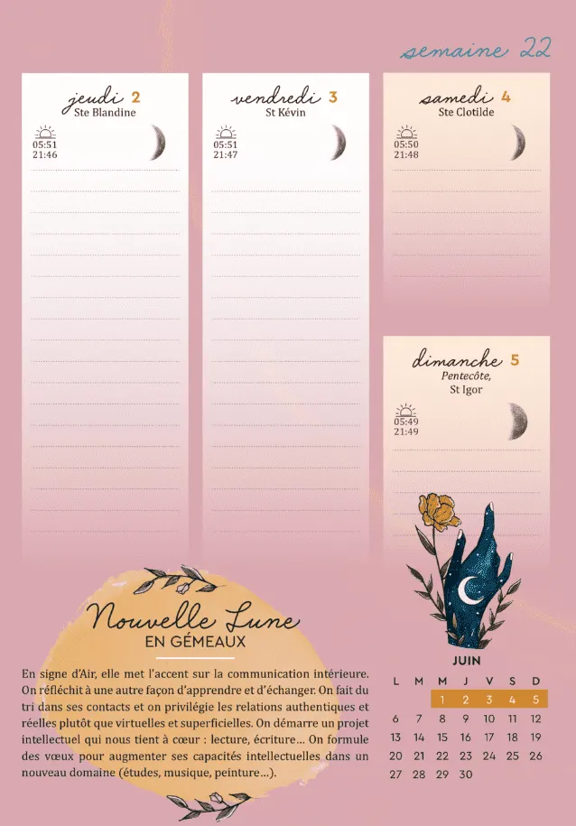 Ce journal de bord witchy vous permettra de trouver le moment le plus propice à la réalisation de votre volonté, d’y noter vos intentions mais aussi vos ressentis, vos humeurs, vos cycles menstruels, afin de vous caler au mieux avec les énergies du jour.