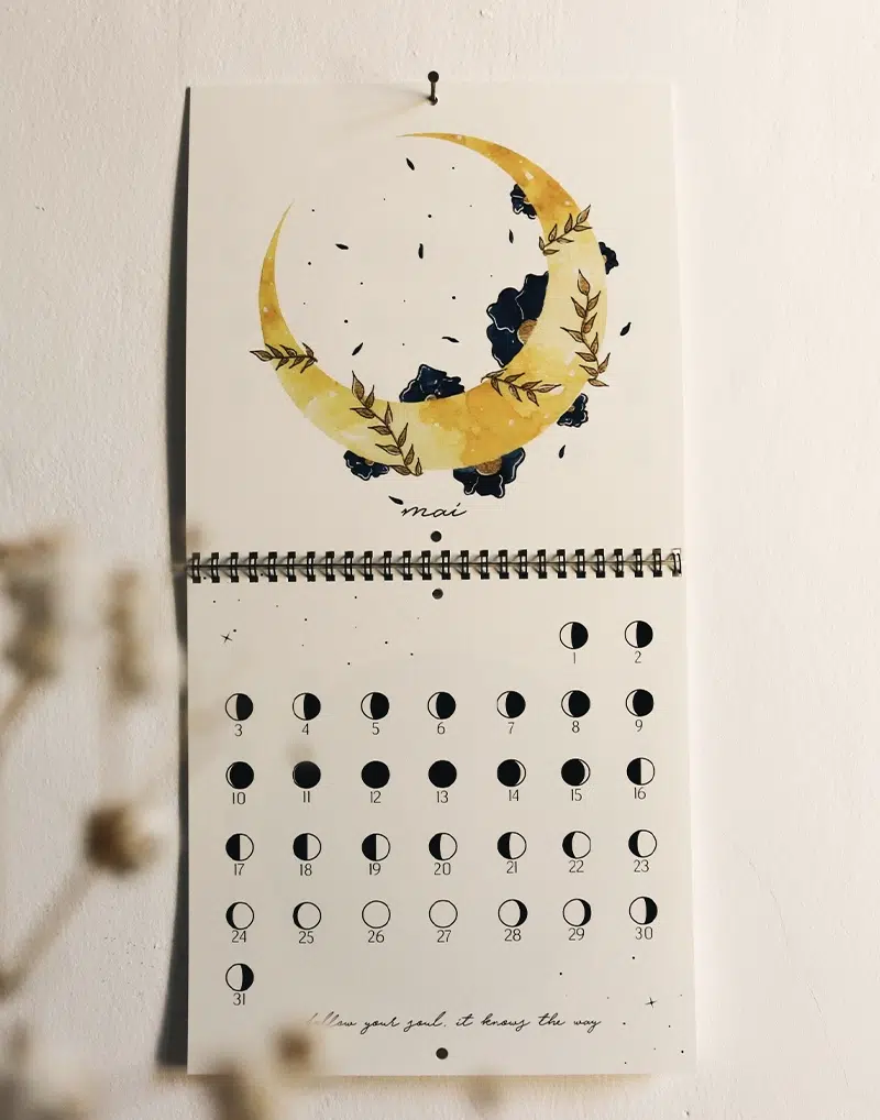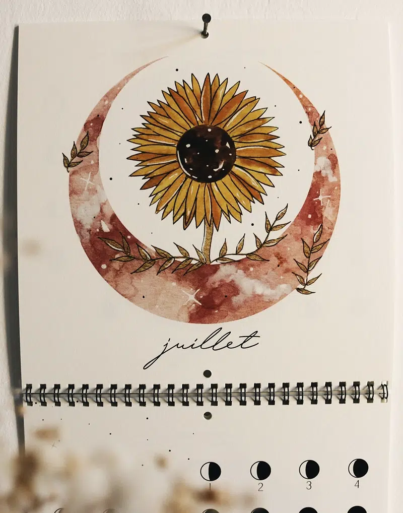 Je réalise chaque année un calendrier lunaire comprenant pour chaque mois les phases de la lune, une illustration et une citation. Au format A4, je l’imprime en Provence sur un papier effet aquarelle avec une reliure permettant l’accrochage murale.