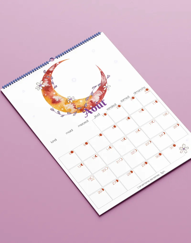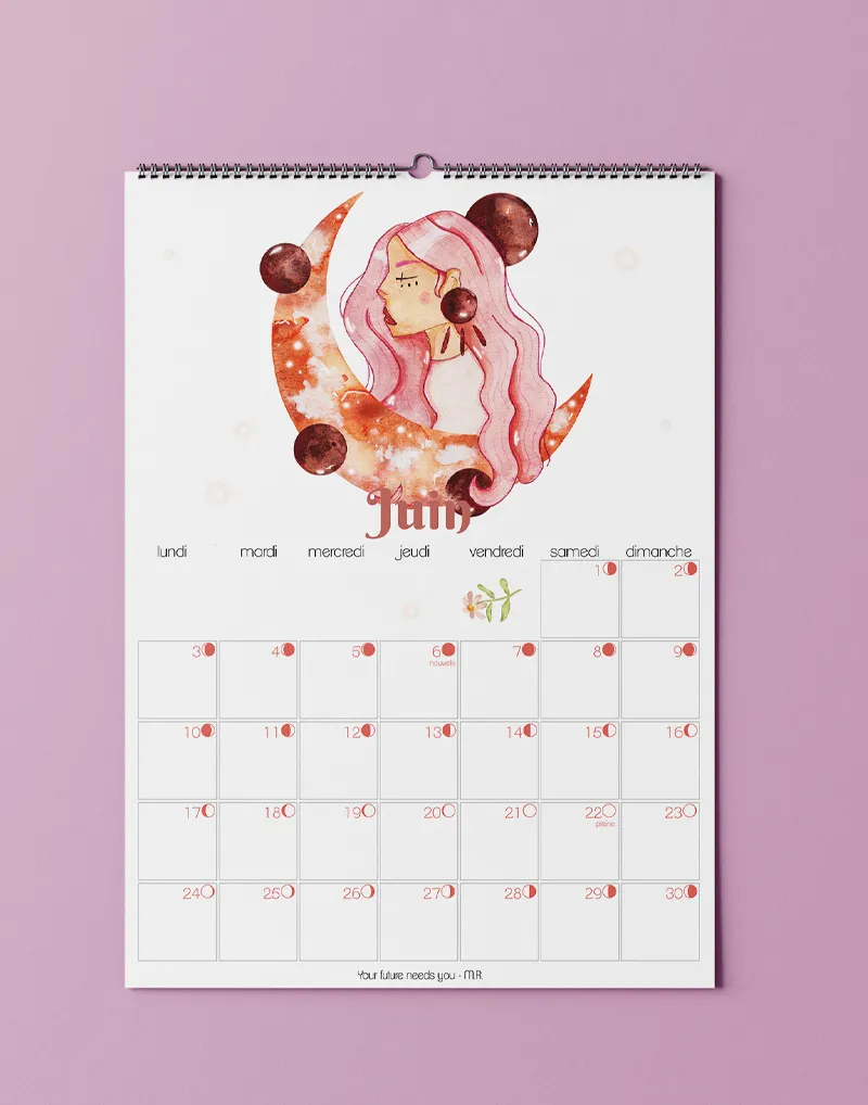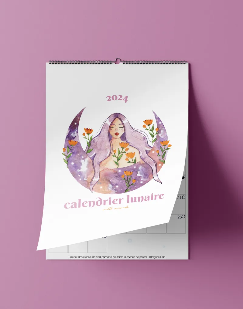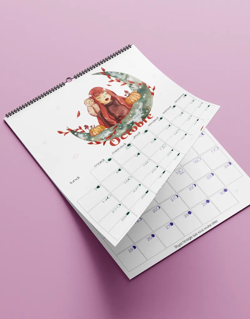 Je réalise chaque année un calendrier lunaire comprenant pour chaque mois les phases de la lune, une illustration et une citation. Au format A4, je l’imprime en Provence sur un papier effet aquarelle avec une reliure permettant l’accrochage murale.