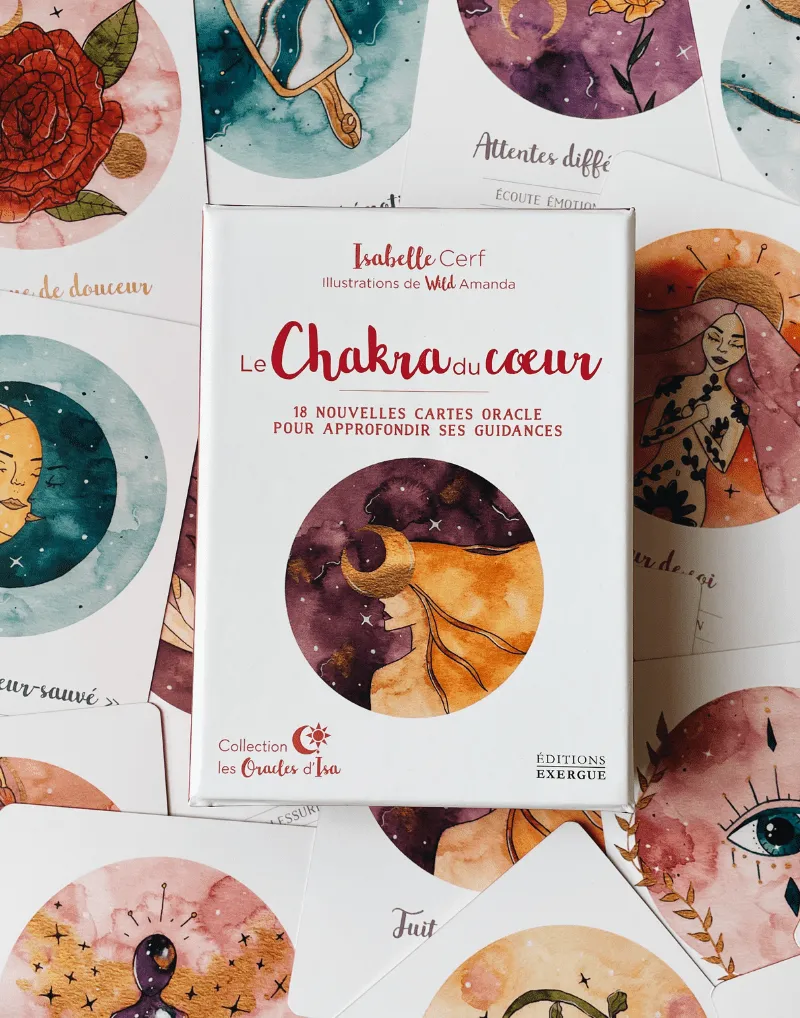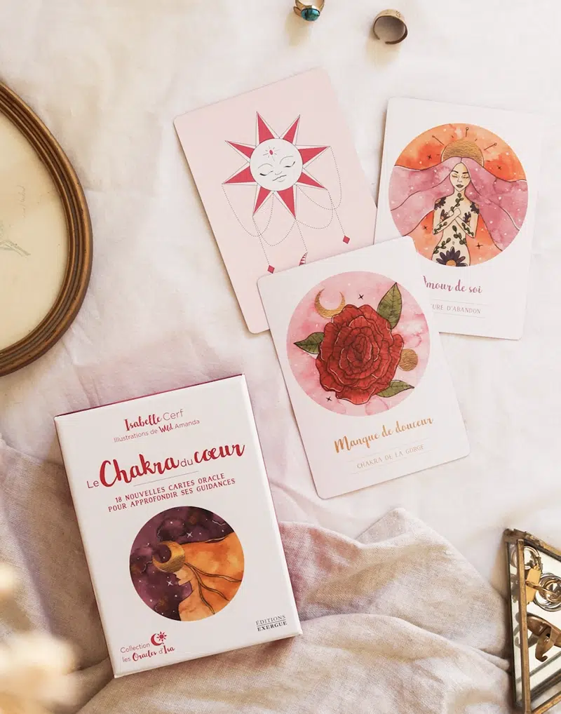 Forte du succès de l’oracle Le Chakra du cœur, Isabelle Cerf a créé 18 nouvelles cartes, pour enrichir et préciser les tirages du premier coffret du même nom dans le domaine sentimental.
