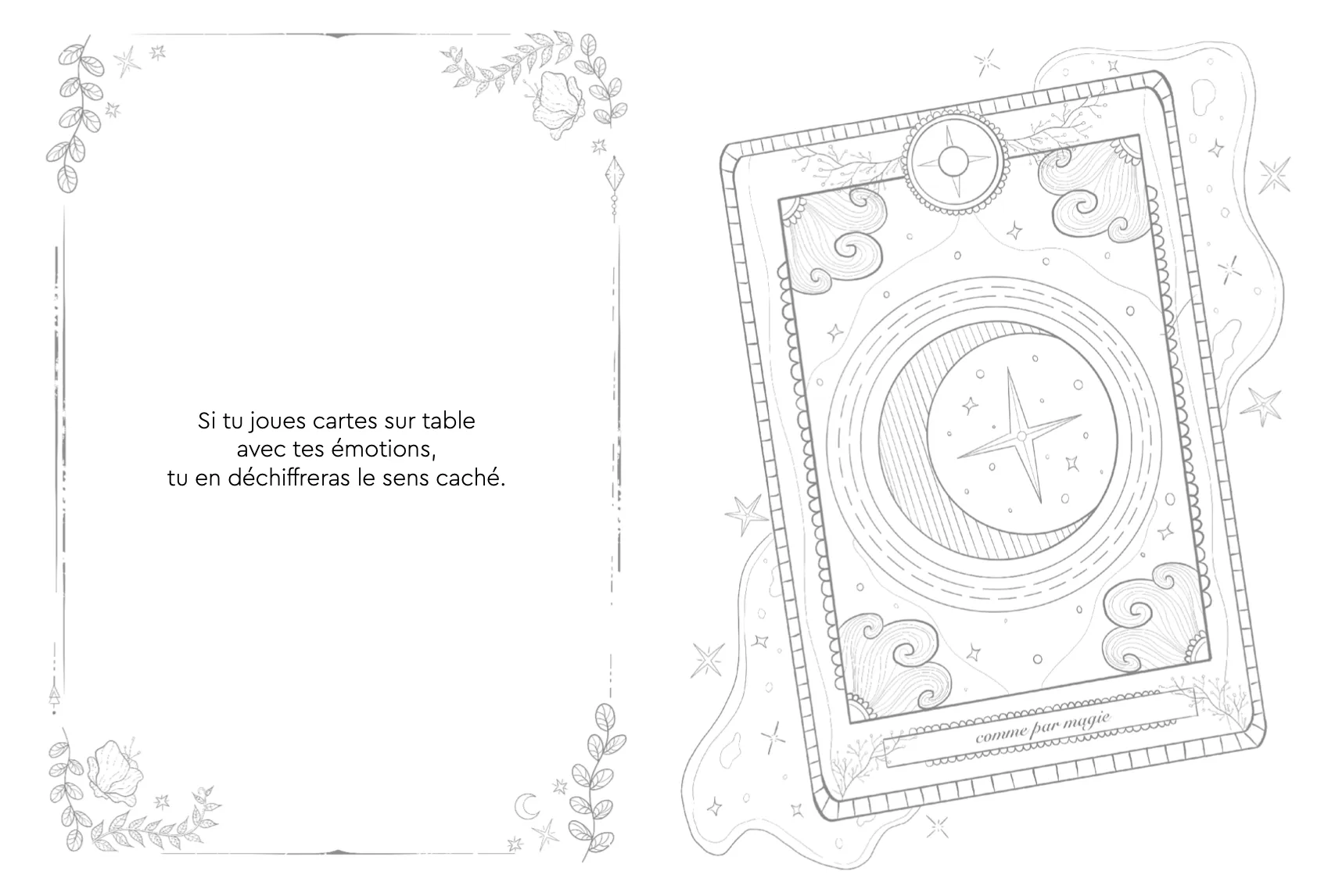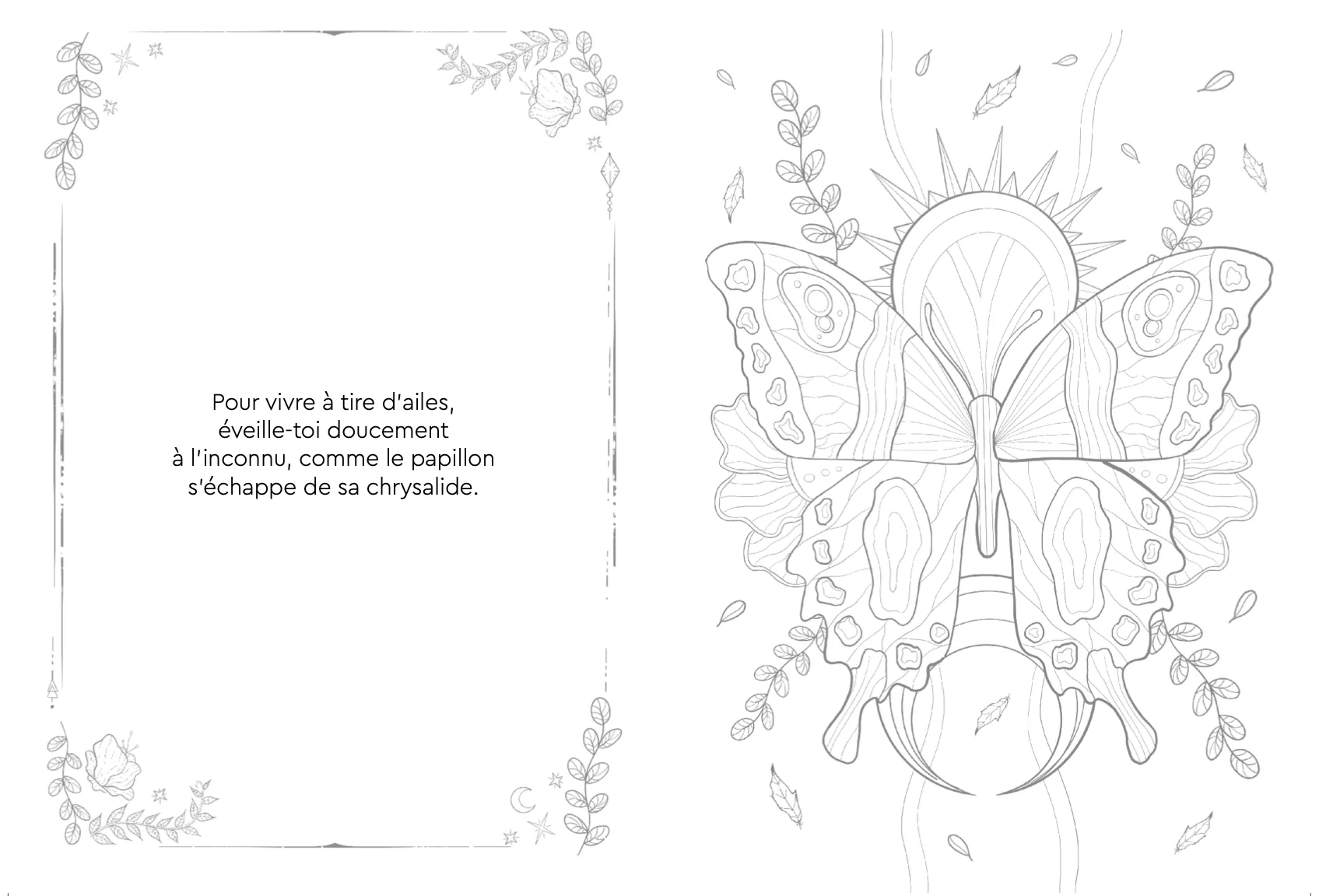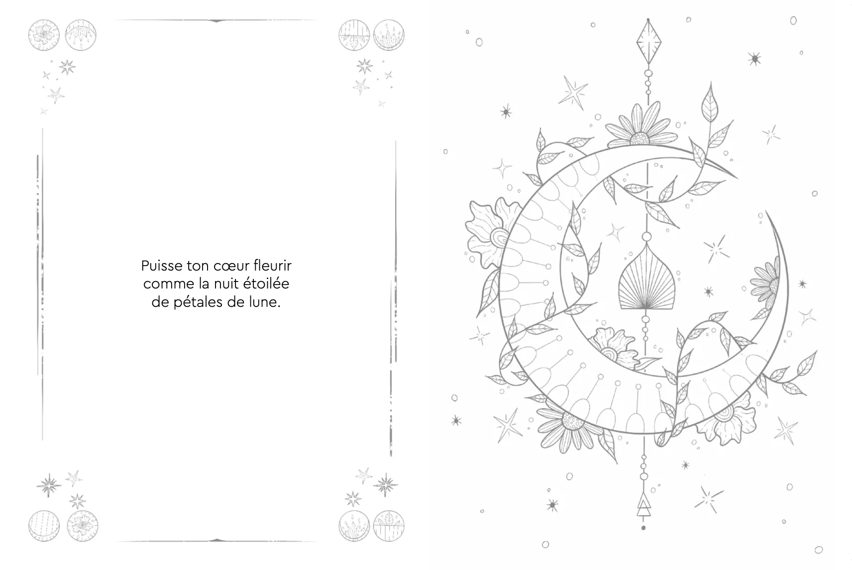 À travers 46 illustrations à colorier, déambulez dans un univers magique composé de cristaux, potions, lunes, étoiles, animaux nocturnes, végétation harmonieuse… Chaque image est accompagnée d’un court texte inspirant.
